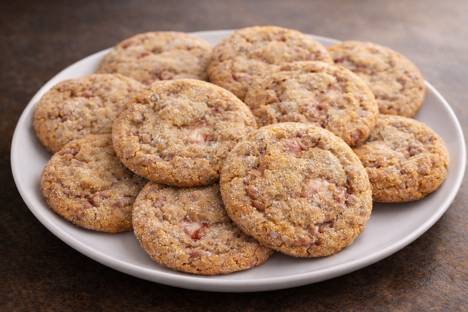 Sweet, creamy, and bakery-style indulgent. This soft, buttery cookie is stuffed with a frozen puck of rich cream cheese and swirled with my homemade strawberry reduction, slow-cooked for deep, real fruit flavor. Each dough ball is rolled in granulated sugar before baking for a delicate sparkle and a lightly crisp exterior that gives way to a soft, chewy center and creamy cheesecake filling.